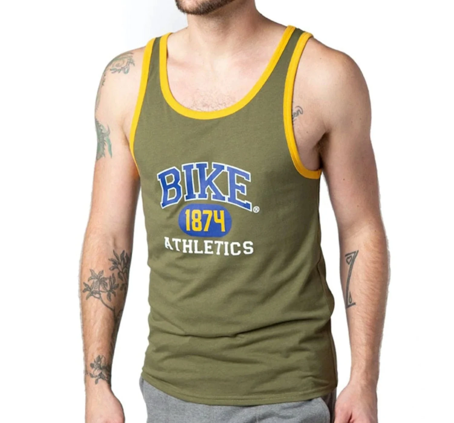 This soft, lightweight tank is perfect for everyday wear and keeps the air flowing during your workout. The Bike Athletic ringer tank top features a rib-knit collar and armhole. The Bike Athletic’s year of establishment, 1874, is in the design across the front. The olive green color is the hottest color of the year.